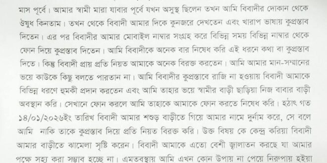 সেখানে ফোন করলে তিনি তাকে ফোন করতে নিষেধ করেন। হঠাৎ গত ১৪ জানুয়ারি বিবাদী আমার শশুড় বাড়ীতে গিয়ে আমার নামে দুর্নাম করে, সে বলে আমি নাকি তাকে কুপ্রস্তাব দিয়ে প্রতি নিয়ত বিরক্ত করি। উক্ত বিষয়কে কেন্দ্র করে বিবাদী আমার বাড়ীতে ঝামেলা সৃষ্টি করেন। বিবাদী আমাকে এতো বেশী জ্বালাতন করছে যা আমার পক্ষে সহ্য করা সম্ভাব হচ্ছে না। আমি নিরুপায় হয়ে থানায় অভিযোগ করেছি।