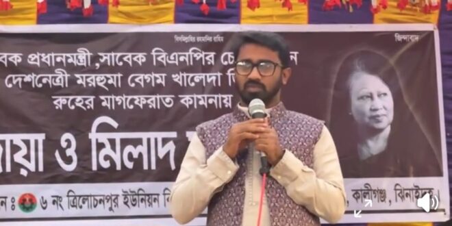 ঝিনাইদহের কালীগঞ্জ উপজেলার ত্রিলোচানপুর ইউনিয় নে সাবেক প্রধানমন্ত্রী ও বিএনপি চেয়ারপারসন বেগম খালেদা জিয়ার রুহের মাগফিরাত কামনায় কোরআন খতম, দোয়া মাহফিল ও আলোচনা সভা অনুষ্ঠিত হয়ে ছে।