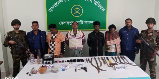 কেশবপুরে যৌথ বাহিনীর অভিযানে ১টি বিদেশী পিস্তল, ৫টি গুলি, ১টি ম্যাগাজিন, ৭টি দেশীয় দা, ১টি খুর, ২টি রামদা, ২টি ইলেকট্রিক শক দেওয়া মেশিন, ১টি টাকা গোনার মেশিন, ৪টি খালি মদের বোতল, ১টি চায়নিজ কুরাল, ১টি চাপাতি, ৩০ পিস ইয়াবা, ১ কেজি গাঁজা ও মাদক সেবনের সরঞ্জাম সহ ৪ জনকে আটক করেছে।
