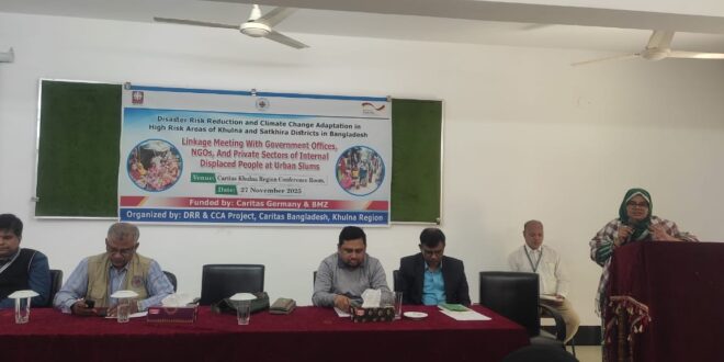 কারিতাস বাংলাদেশ খুলনা অঞ্চলের ডিআরআর সিসিএ প্রকল্পের মাধ্যমে কারিতাস জার্মানি এবং বিএমজেড এর আর্থিক সহায়তায়, খুলনা আঞ্চলিক অফিসের মাইকেল এ. ডি. রোজারিও হল রুমে আজ (২৭নভেম্বর) বৃহস্পতি বার জলবায়ু অভিবাসি ও সরকারি ও বেসরকারি প্রতিষ্ঠা নের সাথে একটি লিংকেজ মিটিং করা হয় । সভায় জল বায়ু অভিবাসী জনগোষ্ঠীর সমস্যা কিভাবে সমাধান করা যায় এটাই ছিলো মুল প্রতিপাদ্য বিষয়।