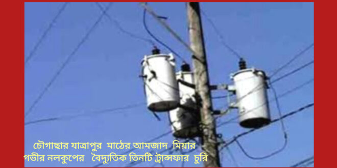 যশোরের চৌগাছায় অর্ধ কোটি টাকার বৈদ্যুতিক ট্রান্স মিটার চুরি হয়েছে। এর ফলে গভীর ও অগভীর নলকু পের মালিকরা অসহায় হয়ে পড়েছেন। এ বিষয়টি দেখার কেউ নেই।
