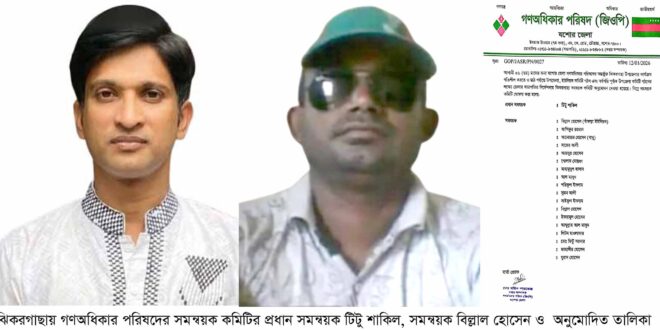 আফজাল হোসেন চাঁদ, ঝিকরগাছা : যশোরের ঝিকর গাছায় গণতন্ত্র, ন্যায়বিচার, অধিকার ও জাতীয়স্বার্থ এই স্লোগানকে সামনে রেখে গণঅধিকার পরিষদের সমন্বয়ক কমিটির অনুমোদন দিয়েছে জেলার সভাপতির নির্দেশ নায় দপ্তর সম্পাদক মো. মহিন পারভেজ।