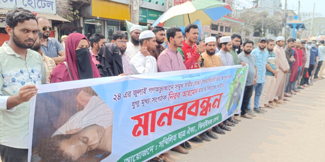 ঝিনাইদহে তেল পাম্পে তেল কেনা নিয়ে বাক-বিতন্ডার জেরে কর্মচারীদের পিটুনিতে নিহত বৈষম্য বিরোধী ছাত্র আন্দোলনের সাবেক যুগ্ম মুখ্য সংগঠক ফারদিন আহ ম্মেদ নিরব হত্যার বিচারের দাবীতে মানববন্ধন কর্মসূচী পালিত হয়েছে।
