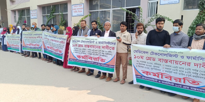 ঝিনাইদহে ১০ম গ্রেড বাস্তবায়নের দাবিতে মেডিকেল টেকনোলজিস্টদের অর্ধ-দিবস কর্মবিরতি
