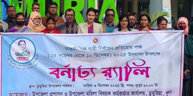 ডুমুরিয়ায় বেগম রোকেয়া দিবস ২০২৫ উদযাপন উপল ক্ষে আলোচনা সভা ও উপজেলা পর্যায়ে নির্বাচিত শ্রেষ্ঠ অদম্য নারীদের সংবর্ধনা অনুষ্ঠান ডুমুরিয়া উপজেলা প্রশাসন ও মহিলা বিষয়ক অধিদপ্তরের আয়োজনে