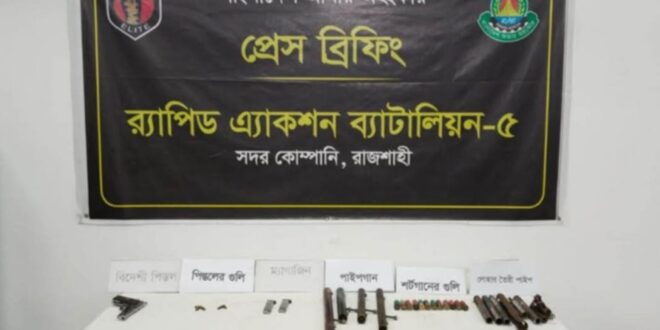 রাজশাহীর তানোরে গভীর রাতে বিশেষ অভিযান চালিয়ে বিদেশি পিস্তল ও বিপুল পরিমাণ দেশীয় অস্ত্রসহ গোলাবা রুদ উদ্ধার করেছে র্যাপিড এ্যাকশন ব্যাটেলিয়ান র্যাব-৫।