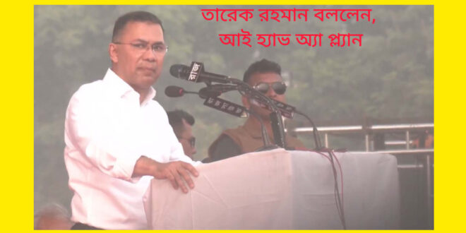আজ এই বাংলাদেশের মাটিতে দাঁড়িয়ে আপনাদের সবার সামনে আমি বলতে চাই, বাংলাদেশ জাতীয়তা বাদী দলের একজন সদস্য হিসেবে আপনাদের সাম নে আমি বলতে চাই—আই হ্যাভ অ্যা প্ল্যান’ ফর দ্য পিপল অব মাই কান্ট্রি, ফর মাই কান্ট্রি (দেশের মানুষে র জন্য, দেশের জন্য আমার একটি পরিকল্পনা আ ছে)।