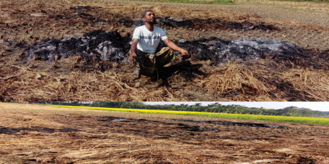 কষ্ট করে উৎপাদিত ধান কেটে শুকানোর জন্য মাঠে রাখা ছিল। গভীর রাতে অজ্ঞাত দুর্বৃত্তরা ধানের গাদায় আগুন ধরিয়ে দিলে মুহূর্তেই সব পুড়ে ছাই হয়ে যায়।