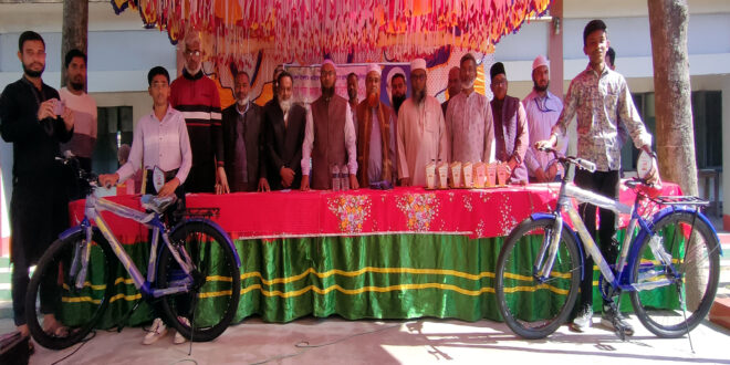 প্রতিযোগিতায় প্রথম স্থান অর্জনকারী দুইজন।শিক্ষার্থীকে পুরস্কার হিসেবে বাইসাইকেল উপহার প্রদান করা হয়েছে।