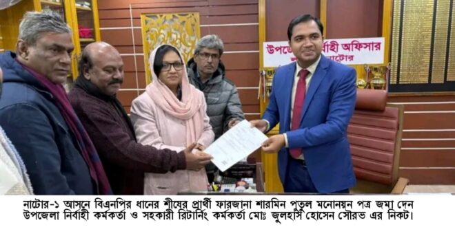 নাটোর-১ (লালপুর–বাগাতি) আসনে বিএনপি মনোনীত ধানের শীষের প্রার্থী, বিএনপির কেন্দ্রীয় নেতা ও সাবেক মন্ত্রী মরহুম ফজলুর রহমান পটল এর কন্যা ব্যরিষ্টার ফারজানা শারমিন পুতুল মনোনয়ন পত্র জমা দিয়েছেন।