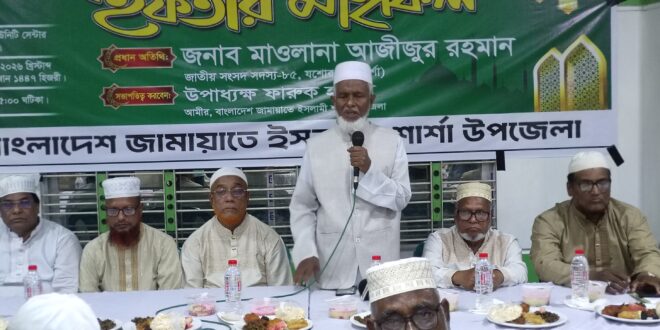 বাংলাদেশ জামায়াতে ইসলামী শার্শা উপজেলা শাখার আমীর উপাধাক্ষ ফারুক হাসানের সভাপতিত্বে ও সেক্রে টারি মাওলানা জাহাঙ্গীর আলমের সঞ্চালনায় অনুষ্ঠিত এ ইফতার মাহফিলে প্রধান অতিথি হিসেবে উপস্থিত ছিলেন যশোর-১ (শার্শা) আসনের জাতীয় সংসদ সদস্য মাওলানা আজীজুর রহমান।