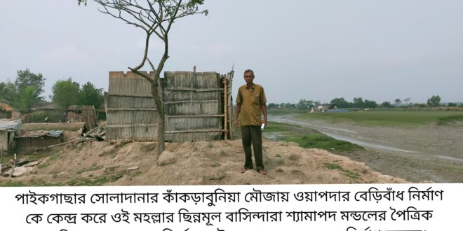 ওই মহল্লারশওকত বলেন অনেকেই শ্যামাপদ মন্ডলের জায়গায় ঘরবাড়ি নির্মাণ করছে,তবে আমরা পানি উন্নয়ন বোর্ডের জায়গার মধ্যে থাকার চেষ্টা করছি বলে তিনি জানান।
