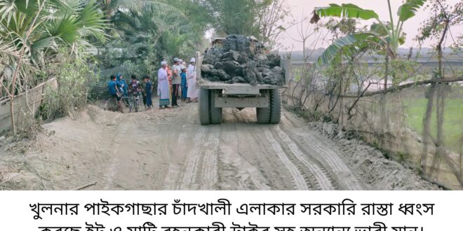 পাইকগাছায় ইট ও মাটি বহনকারী ট্রাক্টর ও ভেকু সহ ভারী যানে ধ্বংস হচ্ছে সরকারি রাস্তা।