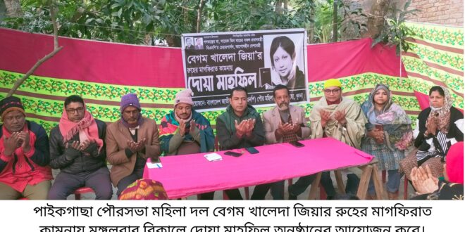পাইকগাছায় বিএনপির চেয়ারপার্সন ও সাবেক প্রধান মন্ত্রী বেগম খালেদা জিয়ার রুহের মাগফিরাত কামনায় দোয়া মাহফিল অনুষ্ঠিত হয়েছে।