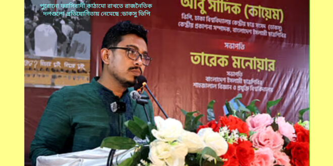 ডেস্ক নিউজ:পুরোনো ফ্যাসিবাদী কাঠামোকে রাখতে রাজনৈতিক দলগুলো প্রতিযোগিতা করছে বলে মন্তব্য করেছেন ঢাকা বিশ্ববিদ্যালয় কেন্দ্রীয় ছাত্র সংসদের (ডাকসু) ভিপি সাদিক কায়েম।