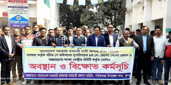 বাংলাদেশ সরকারি কর্মচারী দাবি আদায় ঐক্য পরিষদ সরকার কর্তৃক গঠিত পে কমিশনের সুপারিশকৃত ৯ম পে- স্কেলের গেজেট প্রকাশ ও বাস্তবায়নের লক্ষ্যে কেন্দ্রীয় কমিটি কর্তৃক ঘোষিত অবস্থান ও বিক্ষোভ কর্মসূচির অংশ হিসেবে খুলনা জেলার পাইকগাছা উপজেলা সকল সরকারি দপ্তরের কর্মচারীবৃন্দেরউপস্থিতিতে অবস্থান ও বিক্ষোভ কর্মসূচি পালন করা করেছেন।