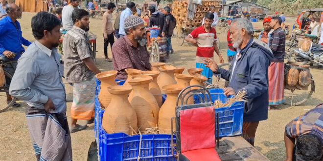 রস সংগ্রহের পরে প্রান্তিক গাছি ও কৃষকেরা তাদের প্রস্তু ত করা খেজুর গুড় বিক্রি করছেন হাটে নিয়ে।