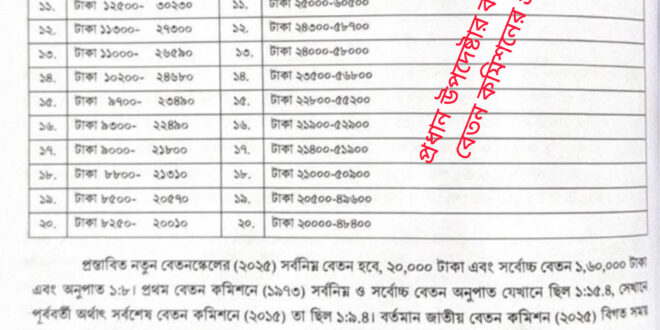 সর্বনিম্ন বেতন স্কেল ৮ হাজার ২৫০ টাকা থেকে বাড়িয়ে ২০ হাজার টাকা করার সুপারিশ করা হয়ে ছে এবং সর্বো চ্চ বেতন স্কেল ৭৮ হাজার টাকা থেকে বাড়ি য়ে এক লাখ ৬০ হাজার টাকা করার সুপারিশ করা হয়ে ছে।