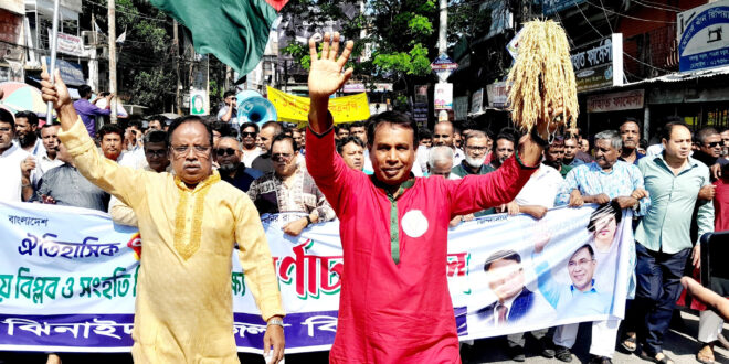 ঢাক-ঢোল ও বাদ্যের তালে তালে র্যালিসহ নানা আয়ো জনে বিপ্লব ও সংহতি দিবস পালন করেছে ঝিনাইদহ জেলা বিএনপি।
