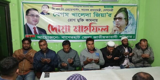 বিএনপি চেয়ারপার্সন ও সাবেক তিনবারের প্রধানমন্ত্রী দেশনেত্রী বেগম খালেদা জিয়ার আশু রোগমুক্তি ও দী র্ঘায়ু কামনায় বাগেরহাটে কুরআন খতম ও দোয়া মাহ ফিল অনুষ্ঠিত হয়েছে।