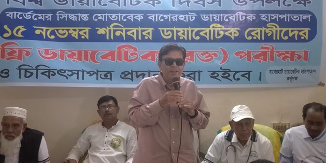 ফকির গোলাম তাবরেজ, বাগেরহাট প্রতিনিধি:কর্মস্থলে ডায়াবেটিস সচেতনতা গড়ে তুলুন’ এই প্রতিপাদ্যে বাগেরহাটে ডায়াবেটিক সমিতির উদ্যোগে বিশ্ব ডায়া বেটিস দিবস পালিত হয়েছে।