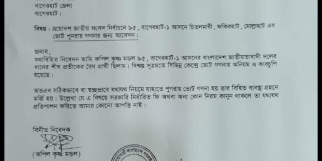 বাংলাদেশ জাতীয়তাবাদী দল (বিএনপি) মনোনীত প্রার্থী কাপিল কৃষ্ণ মণ্ডল স্বাক্ষরিত আবেদনে ভোট গণনার সম য় কিছু কেন্দ্রে অনিয়ম ও ত্রুটির অভিযোগ তোলা হয়ে ছে।