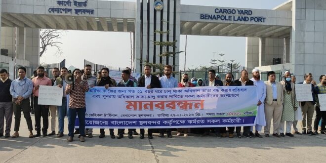 অধিকাল ভাতা বন্ধের প্রতিবাদে বেনাপোলে বন্দর কর্মচা রীদের মানব বন্ধনে আজ একঘন্টা বন্ধ ছিল আমদা নি, রফতানি ও বন্দর থেকে পণ্য খালাস কার্যক্রম।