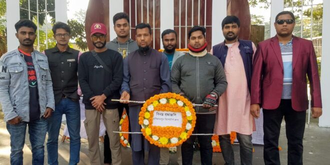 মনিরামপুর প্রতিনিধি:মহান বিজয় দিবস উপলক্ষ্যে কেন্দ্রীয় শহীদ মিনারে পুষ্পস্তবক অর্পণের মাধ্যমে মহান মুক্তিযুদ্ধে আত্মোৎসর্গকারী শহীদদের প্রতি গভীর শ্রদ্ধা নিবেদন করেছেন মণিরামপুর রিপোর্টার্স ক্লাবের সদস্য বৃন্দ।