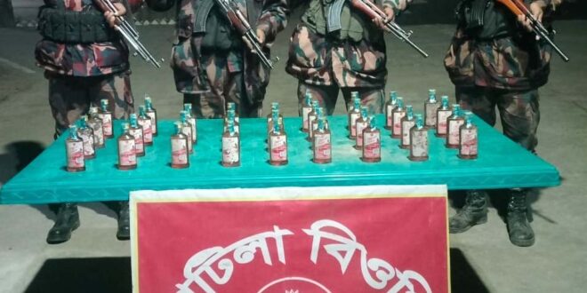 মহেশপুর ব্যাটালিয়ন (৫৮ বিজিবি)’র সহকারী পরিচালক মুন্সী ইমদাদুর রহমানের স্বাক্ষরিত বিজিবি’র এক প্রেস বি জ্ঞপ্তিতে জানাযায়, মঙ্গলবার (২৭ জানুয়ারি) আনুমানিক ৭.৫০মিনিটের সময় মহেশপুর ব্যাটালিয়ন (৫৮ বিজিবি) এর অধীনস্থ মাটিলা বিওপি’র দায়িত্বপূর্ণ এলাকার সীমা ন্ত পিলার-৫২/১০-এস হতে আনুমানিক ২০০ গজ বাং লাদেশের অভ্যন্তরে মাটিলা মাঠপাড়া গ্রামের মোঃ জাহা ঙ্গীর আলম এর ড্রাগন বাগানের মধ্যে হতে হাবিলদারমোঃ শহিদুল ইসলাম এর নেতৃত্বে মাদক বিরোধী অভিযান পরি চালনা করে আসামীবিহীন ৩৩ বোতল ভারতীয় মদ উদ্ধা র করা হয়।