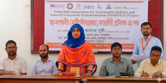 বাগেরহাটের মোংলায় মৎস্যজীবীদের টেকসই জীবিকা নিশ্চিত করা, উপকূলীয় পরিবেশ সংরক্ষণ এবং জলজ সম্পদের সুষ্ঠু ব্যবস্থাপনা জোরদার করতে বহু অংশজ নীয় (মাল্টি-স্টেকহোল্ডার) মৎস্যজীবী প্লাটফর্মের এক গুরুত্বপূর্ণ সভা অনুষ্ঠিত হয়েছে। মঙ্গলবার (১০ মার্চ ২০২ ৬) সকালে মোংলা উপজেলা কৃষি সম্প্রসারণ অধিদপ্ত রের হলরুমে এ সভা অনুষ্ঠিত হয়।