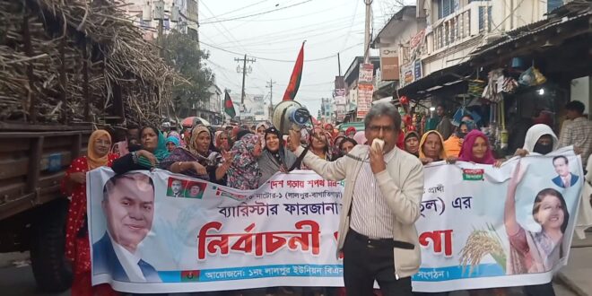 নাটোরের লালপুরে বিএনপির ধানের শীষের প্রার্থী ব্যারি ষ্টার ফারজানা শারমিন পুতুলের পক্ষে উপজেলার ১০টি ইউনিয়ন ও একটি পৌরসভায় গন মিছিল অনুষ্ঠিত হয়েছে।