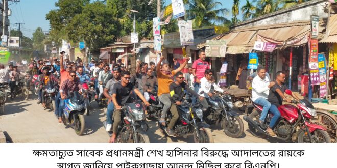 ক্ষমতাচ্যুত সাবেক প্রধানমন্ত্রী শেখ হাসিনার বিরুদ্ধে জুলাই হত্যাকান্ডের মামলায় আদালতের রায়কে স্বাগত জানিয়ে আনন্দ মিছিল করেছে পাইকগাছা বিএনপি।