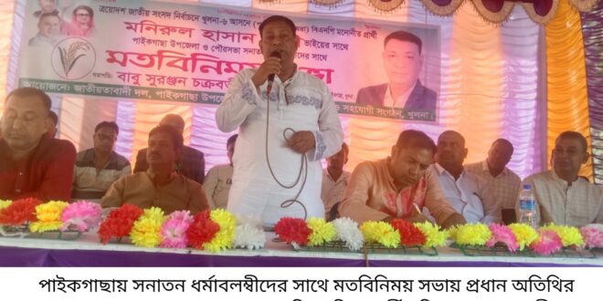 ত্রয়োদশ জাতীয় সংসদ নির্বাচন উপলক্ষে তিনি বৃহস্পতি বার দুপুরে নির্বাচনী এলাকা পাইকগাছার সরল কালীবা ড়িস্থ কেন্দ্রীয় পূজা মন্দির চত্বরে সনাতন ধর্মালম্বীদের সা থে মতবিনিময় কালে প্রধান অতিথির বক্তব্যে এসব কথা।বলেন।