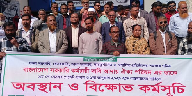 ৯ম পে-স্কেলের গেজেট দ্রুত প্রকাশ এবং ২০২৬ সালের ১ জানুয়ারি থেকে তা কার্যকর করার দাবিতে বাগেরহাটের মোংলায় তিনদিনব্যাপী অবস্থান ও বিক্ষোভ কর্মসূচি পাল ন করেছেন সরকারি ও বেসরকারি বিভিন্ন দপ্তরের শিক্ষ ক-কর্মচারীরা।