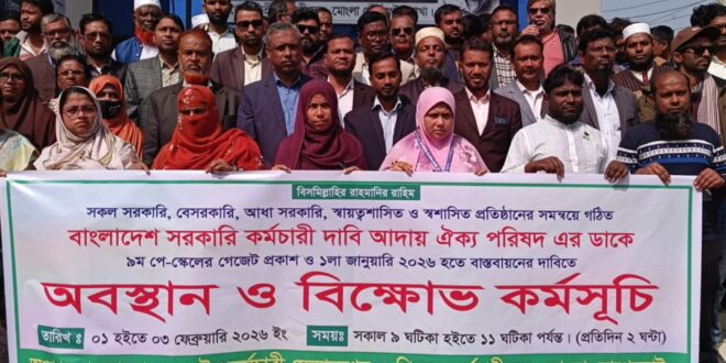 ৯ম পে-স্কেলের গেজেট প্রকাশ ও তা ২০২৬ সালের ১ জানুয়ারি থেকে কার্যকর করার দাবিতে সরকারের দীর্ঘ সূত্রিতা ও উদাসীনতার প্রতিবাদে মোংলায় টানা তিনদিন অবস্থান ও বিক্ষোভ কর্মসূচি পালন করেছেন সরকারি, আধা সরকারি, স্বায়ত্তশাসিত ও বেসরকারি প্রতিষ্ঠানের শিক্ষক-কর্মচারীরা।