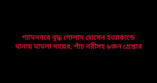 সাতক্ষীরা প্রতিনিধি ।। সাতক্ষীরায় জমিজমা সংক্রান্ত বিরোধের জেরধরে শ্যাম নগরে প্রতিপক্ষের ছুরিকাঘাতে গোলাম হোসেন মোড়ল (৬০) নামে এক বৃদ্ধ নিহত হওয়ার ঘটনায় থানায় একটি হত্যা মামলা দায়ের করা হয়েছে। নিহতের ছোট ভাই শ্যামনগর উপজেলার জাবাখালী গ্রামের মৃত হামিজ উদ্দিন মোড়লের ছেলে মো. আব্দুল গফুর মোড়ল বাদী হয়ে শনিবার (২০ ডিসেম্বর) …