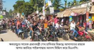 পাইকগাছা (খুলনা) প্রতিনিধিঃ ক্ষমতাচ্যুত সাবেক প্রধানমন্ত্রী শেখ হাসিনার বিরুদ্ধে জুলাই হত্যাকান্ডের মামলায় আদালতের রায়কে স্বাগত জানিয়ে আনন্দ মিছিল করেছে পাইকগাছা বিএনপি। বিএনপি ও অঙ্গ সহযোগী সংগঠনের নেতাকর্মীরা ১৭ নভেম্বর বিকালে মোটরসাইকেল শোভাযাত্রা করে উপ জেলা সদরের প্রধান সড়ক প্রদক্ষিণ করে আনন্দ মিছিল করে। উপজেলা বিএনপির সদস্য সচিব এসএম ইমদাদুল হ …