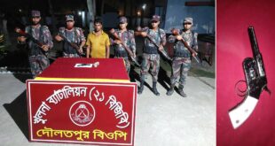 শার্শা প্রতিনিধি :যশোরের বেনাপোল সীমান্তের দৌলতপুর থেকে একটি পিস্তলসহ আতাউর রহমান না মে একজন আটক করেছে বিজিবি সদস্যরা। বুধবার (২৮ অক্টোবর) ভোরে ২১ ব্যাটালিয়নের বিজিবি সদস্যরা তাকে আটক করে। আটক বেনাপোল সীমান্তের পুটখালী ইউনিয়নের দৌল তপুর গ্রামের সোলাইমান হোসেনের ছেলে। বিজিবি জানায়, তাদের কাছে অস্ত্র চোরাচালানের গোঁপন খবর আসে। এসময় …