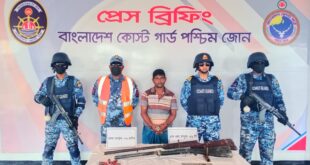 ফকির গোলাম তাবরেজ, বাগেরহাট প্রতিনিধিঃ সুন্দরবনের দুর্ধর্ষ ডাকাত রাঙ্গা বাহিনীর প্রধানকে অস্ত্র ও গোলাবারুদসহ আটক করেছে কোস্ট গার্ড। রবিবার ২৬ অক্টোবর ২০২৫ তারিখ দুপুরে কোস্ট গার্ড মিডিয়া কর্মকর্তা লেফটেন্যান্ট কমান্ডার সিয়াম-উল-হক এ তথ্য জানান। তিনি বলেন, গোপন সংবাদের ভিত্তিতে জানা যায়, সুন্দর বনের কুখ্যাত ডাকাত রাঙ্গা বাহিনীর সদস্যরা সুন্দরবনের শিবসা …