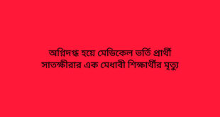 সাতক্ষীরা প্রতিনিধি।। অগ্নিদগ্ধ হয়ে মেডিকেলে ভর্তি প্রার্থী সাতক্ষীরা এক মেধা বী নারী শিক্ষার্থীর মৃত্যু হয়েছে। ঢাকা মেডিকেল কলেজ হাসপাতালের বার্ন ইউনিটে চিকি ৎসাধীন অবস্থায় সোম বার (২৪ নভেম্বর) বেলা ১১ টার দিকে তার মৃত্যু হয়। এর আগে গত মঙ্গলবার(১৮ নভেম্বর) গ্যাসের চুলায় ডিম সিদ্ধ করার সময় গায়ের ওড়নায় আগুন লেগে …