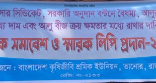 আলিফ হোসেন,তানোরঃ রাজশাহীর তানোরে সার সিন্ডিকেট, সেচের পানির সমস্যা ও আলুর ন্যায্য দাম নিশ্চিতকরণ দাবিতে কৃষক সমাবেশ করেছে কৃষকরা। রোববার (২৬ অক্টোবর) দুপুরে তানোর উপজেলা চত্বরে বাংলাদেশ কৃষক ও শ্রমিক কল্যাণ ফেডারেশনের আয়ো জনে এই সমাবেশ অনুষ্ঠিত হয়। বাংলাদেশ কৃষক ও শ্রমিক কল্যাণ ফেডারেশনের তানোর পৌরসভার সভাপতি আজহার হোসেনের সভাপতিত্বে …